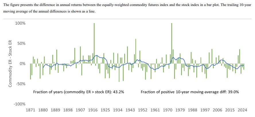 Moreover, commodity futures have outperformed equities in roughly 43% of years and in two out of every five decades, suggesting distinct return drivers and meaningful diversification benefits.