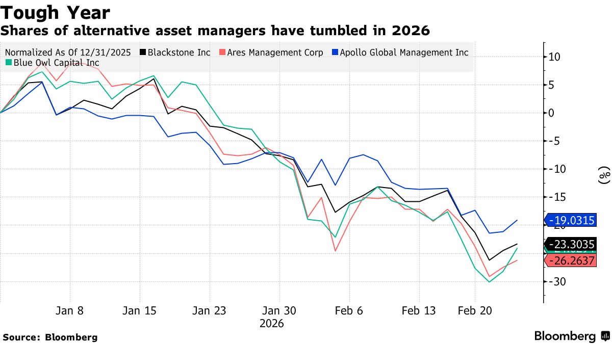 These two bearish dynamics make for a tough slog for the large alternative investment platforms, whose shares have plummeted this year as the AI killing software thesis proliferates. Given the sheer size and breadth of the exposure, the destruction of the software business model could represent an extinction-level event for the private equity industry.