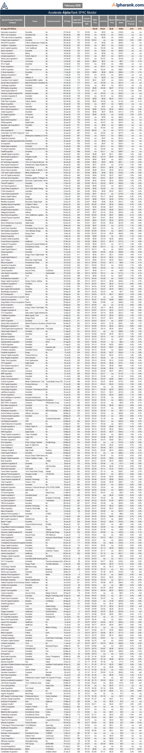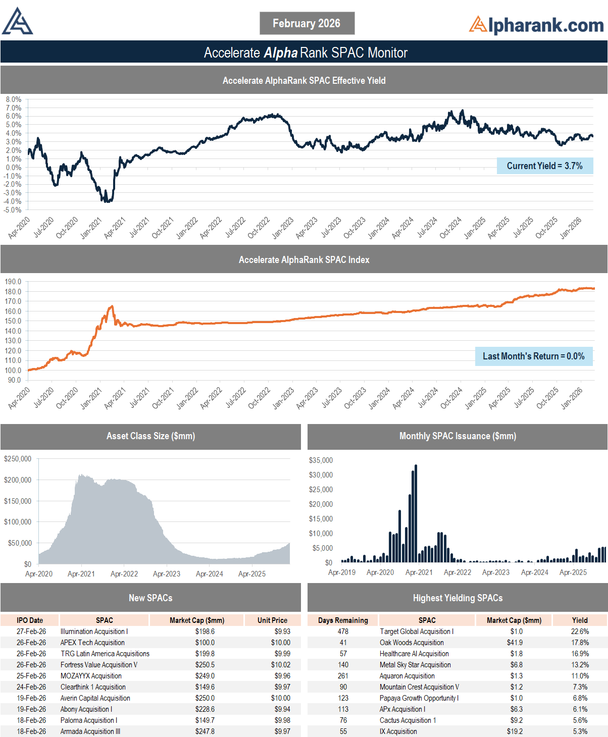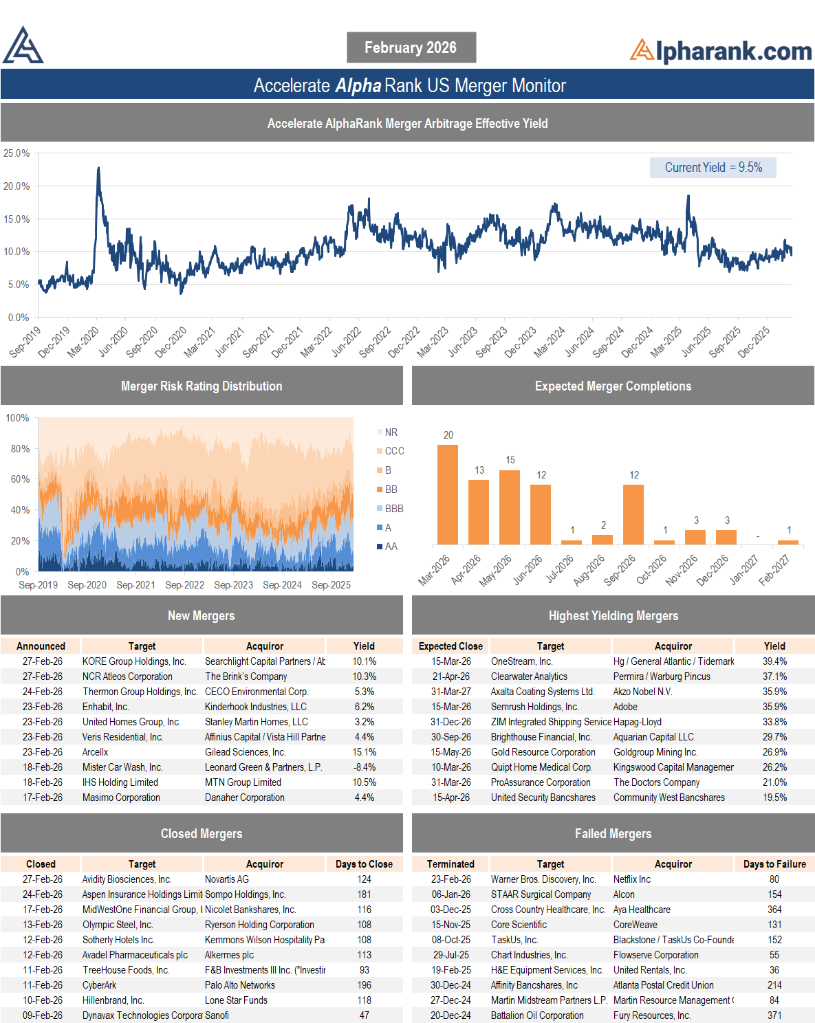 The AlphaRank.com Merger Monitor below represents Accelerate’s proprietary analytics database on all announced liquid U.S. mergers. The AlphaRank Merger Arbitrage Effective Yield represents the average annualized returns of all outstanding merger arbitrage spreads and is typically viewed as an alternative to fixed income yield.