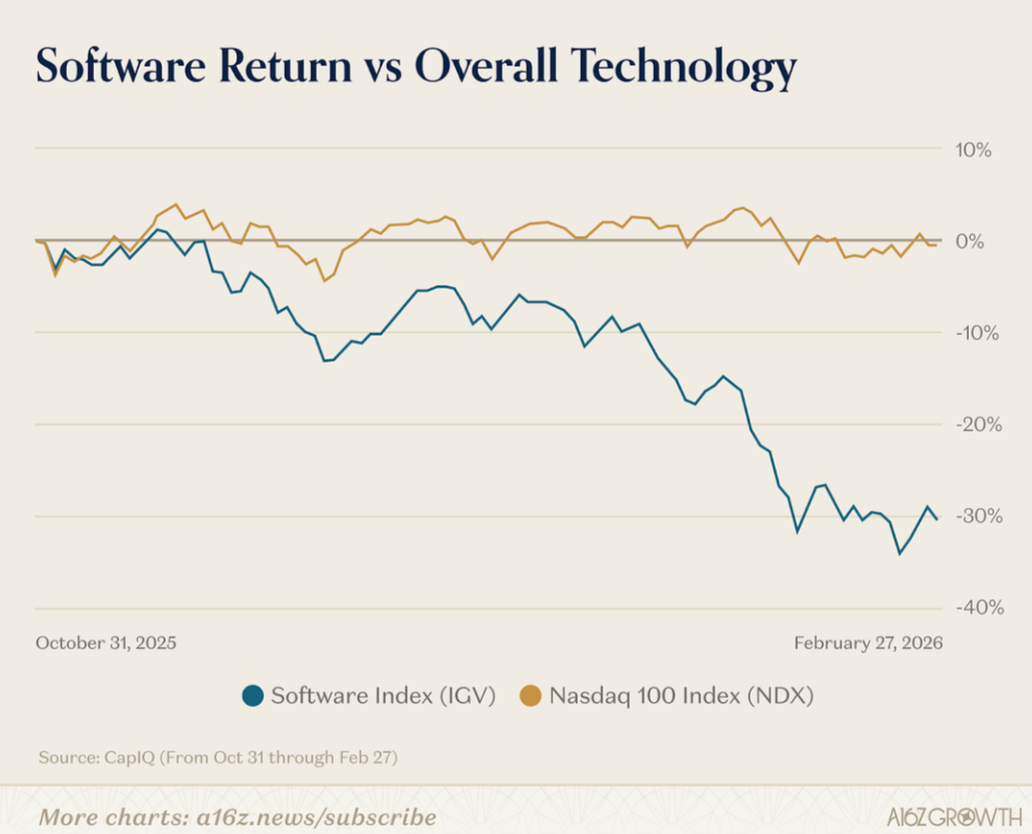 Given the rapidly emerging risks and heightened fear that AI will displace SaaS applications, any security related to this theme has been punished by the market. Software equities have fallen by more than -30% over the past four months.