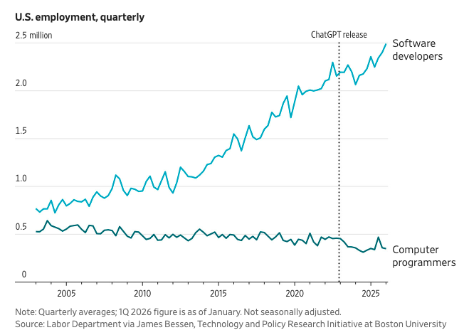 One datapoint that refutes the challenge to employment posed by AI: the ranks of software developers are up 5% in January from a year earlier. The number of software development jobs has increased by several hundred thousand since ChatGPT was released. Also, business spending on software leapt 11% in Q4 from a year earlier, the fastest in nearly three years.