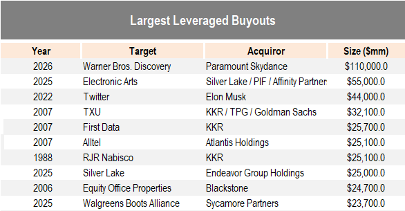 Furthermore, just over two months later, Paramount Skydance announced a far larger LBO – the $110 billion buyout of Warner Bros Discovery. The deal is double the size of the previous record largest LBO announced mere months prior. As for the disruption risk there, some of the AI-generated movies that users create through ByteDance’s Seedance 2.0 model have some Hollywood executives in a panic.