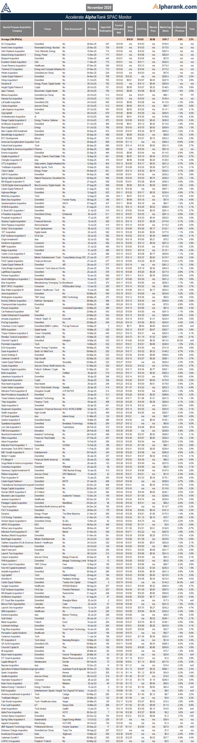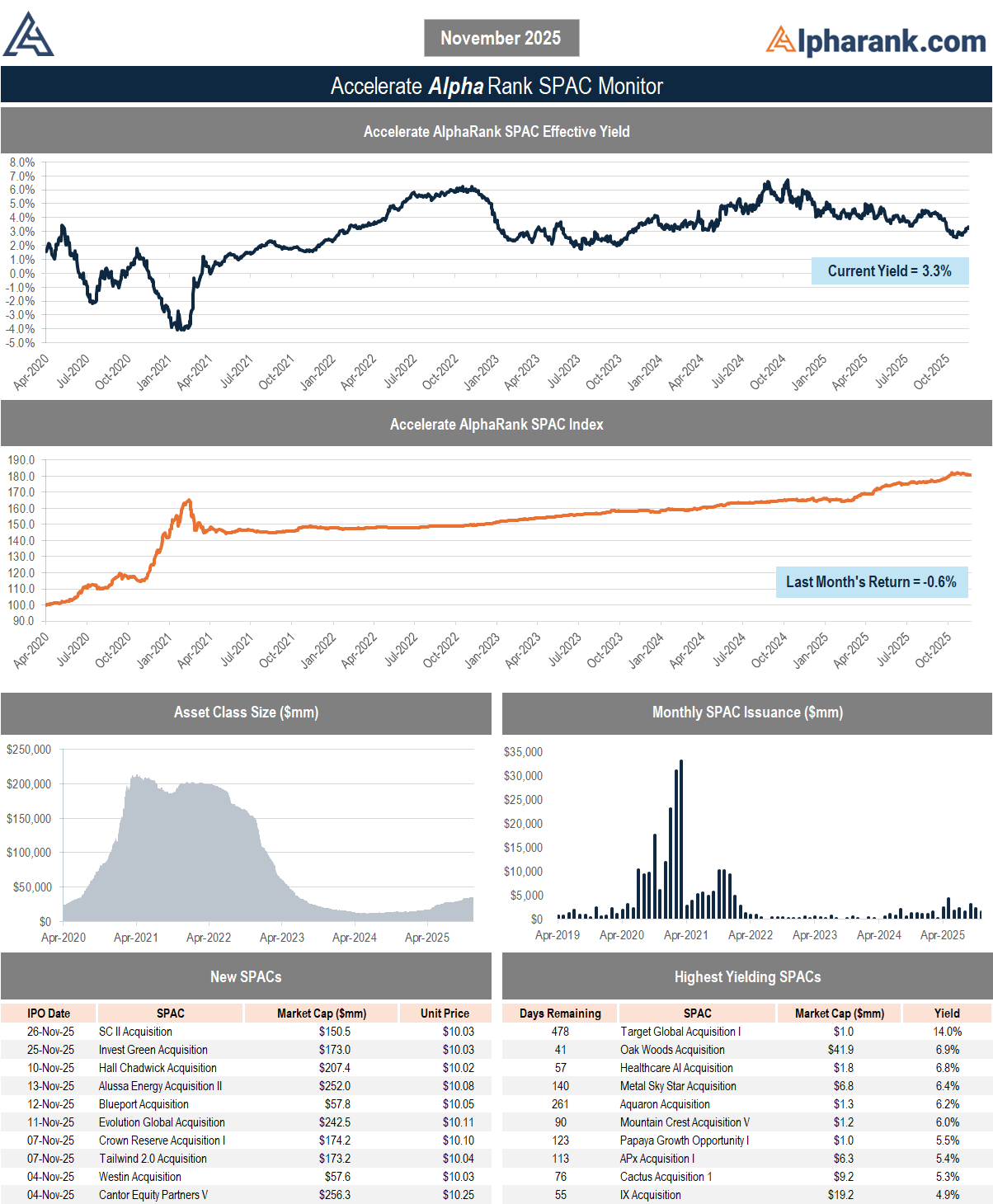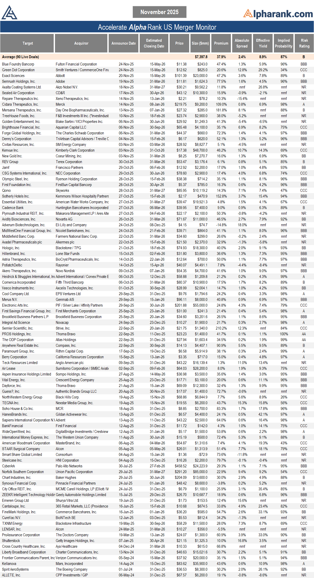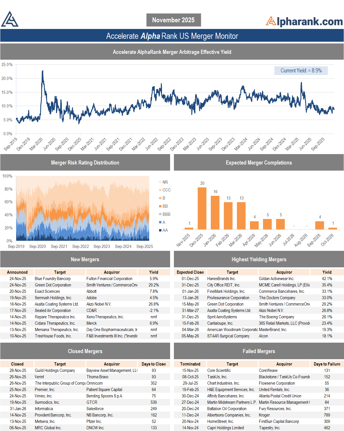 The AlphaRank.com Merger Monitor below represents Accelerate’s proprietary analytics database on all announced liquid U.S. mergers. The AlphaRank Merger Arbitrage Effective Yield represents the average annualized returns of all outstanding merger arbitrage spreads and is typically viewed as an alternative to fixed income yield.