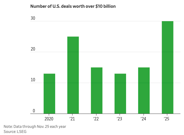 In 2025, transactions larger than $10 billion have climbed to record levels, fueled by the Trump administration’s deregulatory drive that has re-energized Wall Street and set off a wave of global dealmaking.