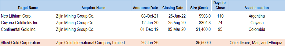 On Monday, large cap Chinese gold mining company Zijin Gold announced the friendly acquisition of TSX-listed African gold producer Allied Gold for $5.0 billion.